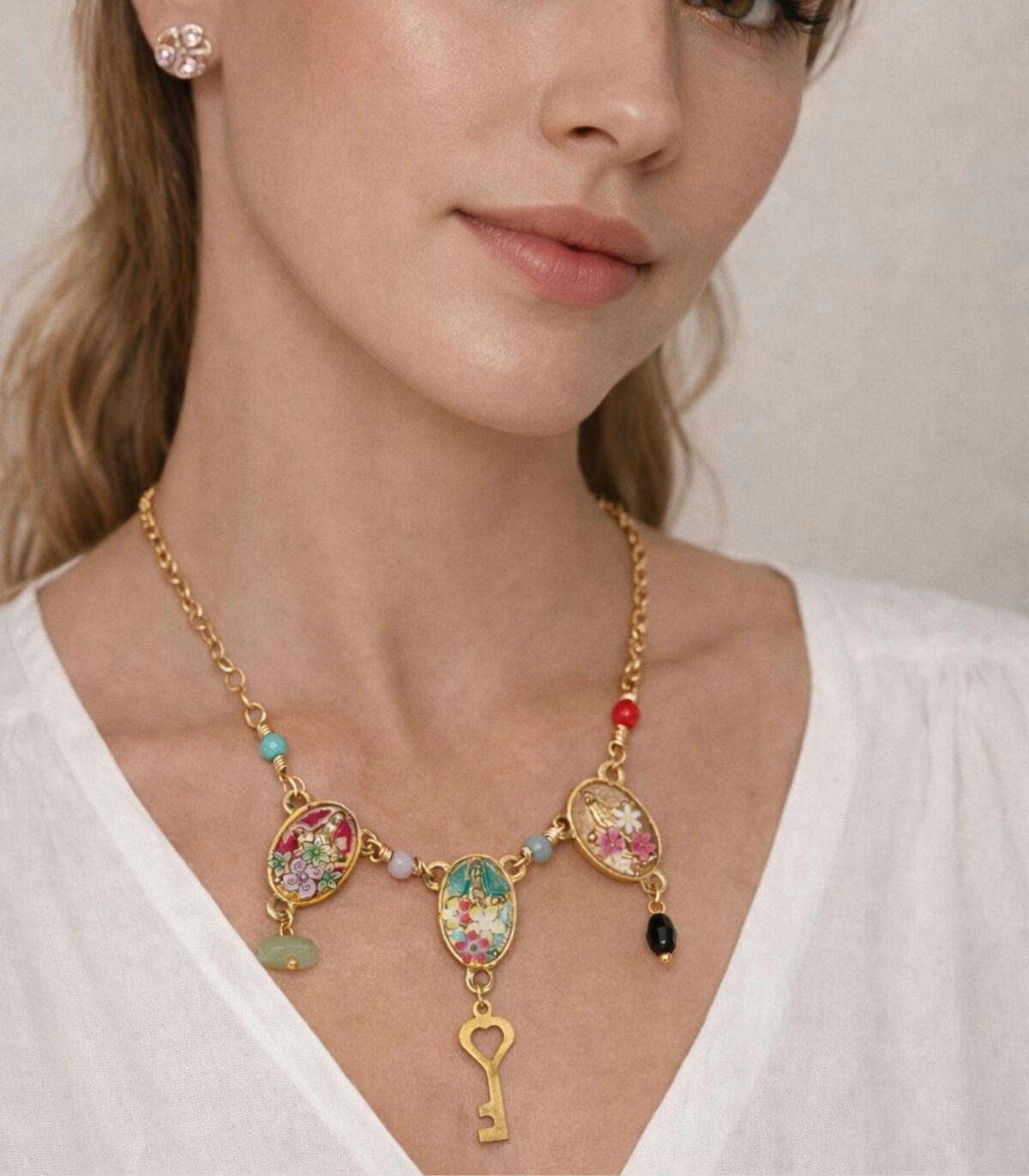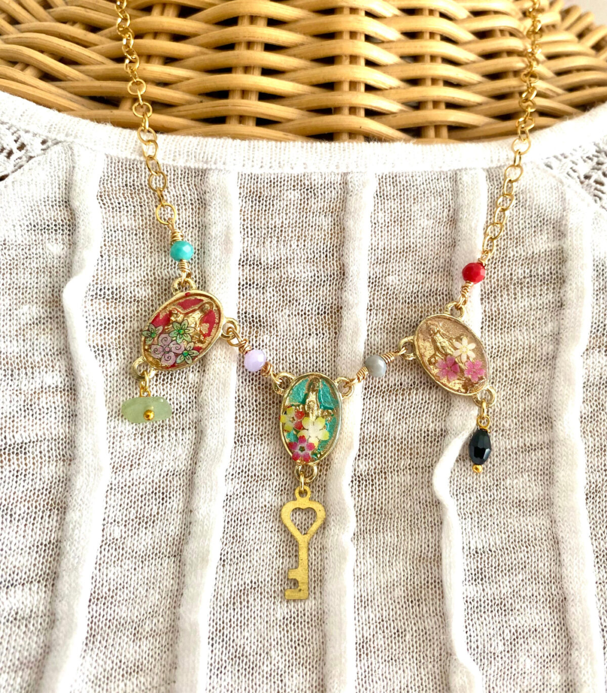Collana realizzata in cristalli, medaglie benedette dipinte e personalizzate a mano