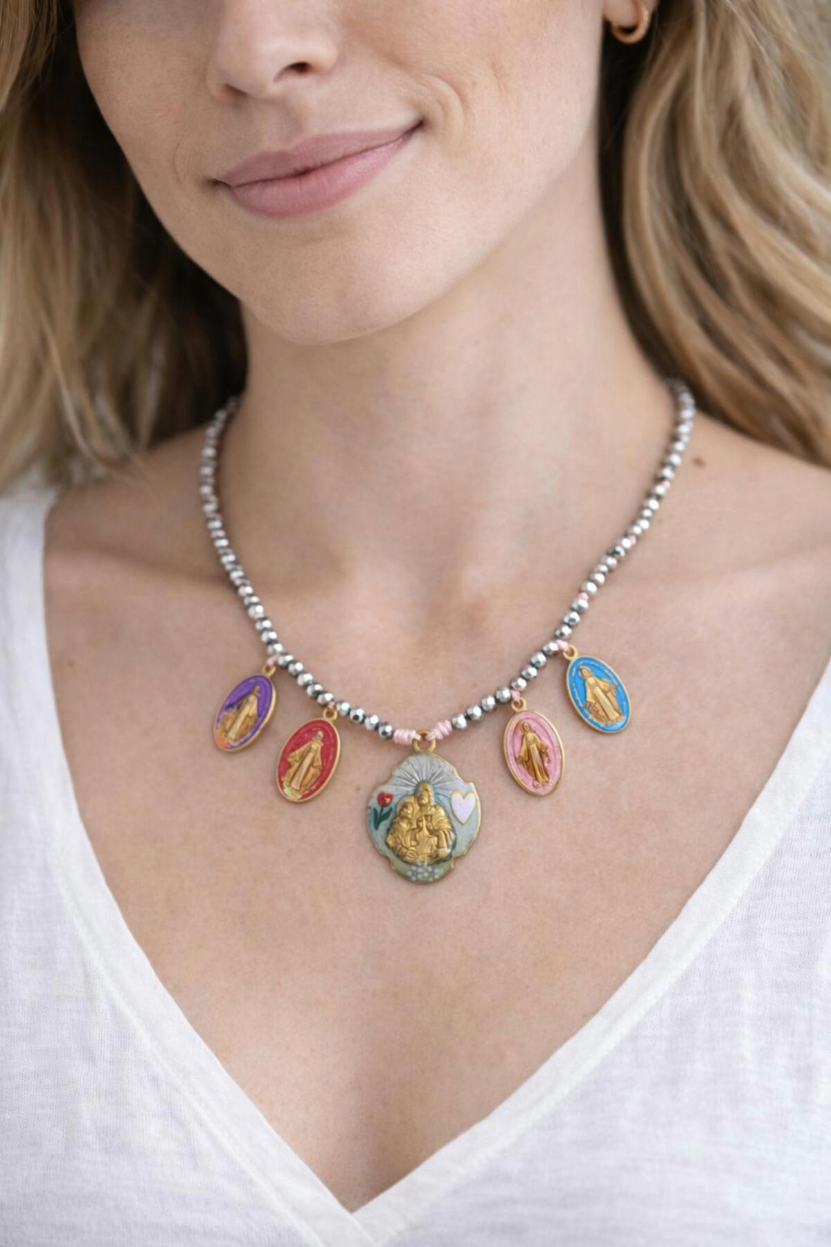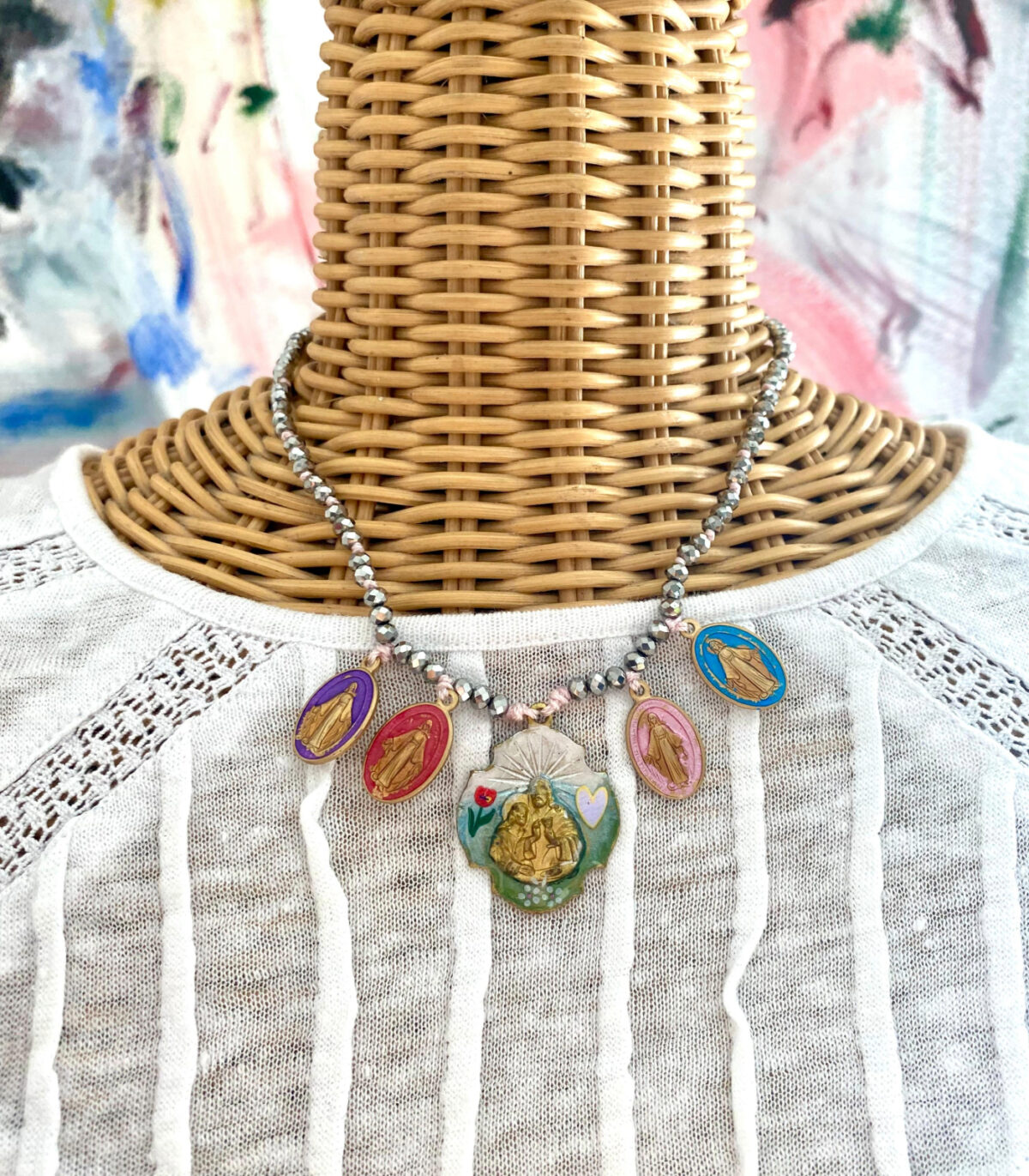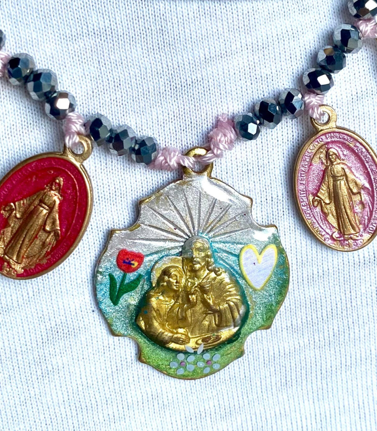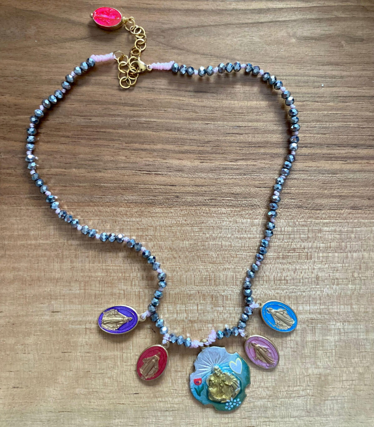 Collana realizzata in cristalli, medaglie benedette dipinte a mano